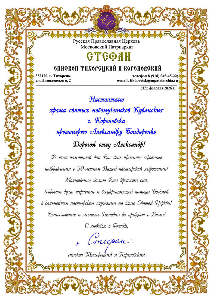 После Божественной Литургии был оглашён поздравительный адрес владыки Стефана епископа Тихорецкого и Кореновского отцу Александру. Прихожане нашего храма сердечно поздравили нашего дорогого батюшку со знаменательной датой — 30-летием иерейской хиротонии. Читать далее